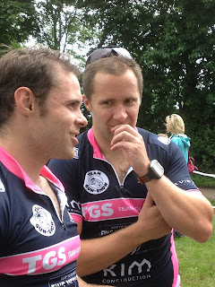 At the finish the boys had been done and dusted for a while. Roly in his role as ‘social’ member of TGS had gone and beaten the lot of us although JK and WJD were considerably closer than they had been last year. We will put his performance down to completing the Haute Route in April - good altitude training [see his blog here: http://rolyrouleletour.blogspot.co.uk/] Analysis of the times and performances to follow. The only real casualty was Pughy. I’d noticed he didn’t exactly look like he was enjoying himself on the out and back section of the run but when he finished the blood stains on his trainers were evidence that he had suffered from some pretty severe blisters during the run – one very good reason to use talcum powder in your socks and shoes coming off the swim / bike to soak up any excess water. Not helped by a very damp transition area. Good effort to keep going I say.